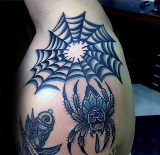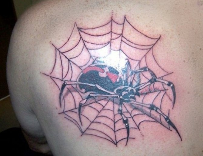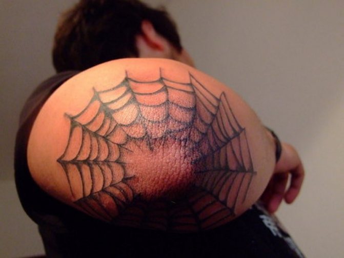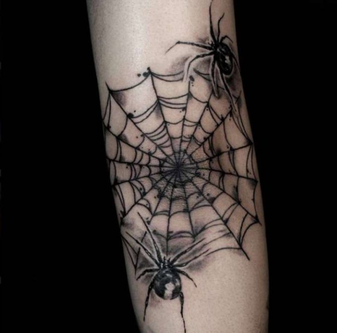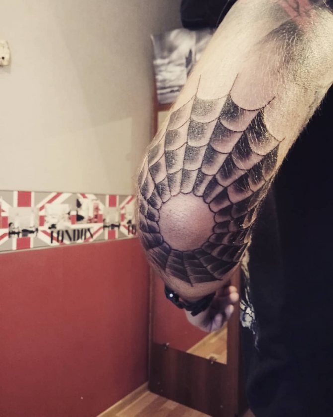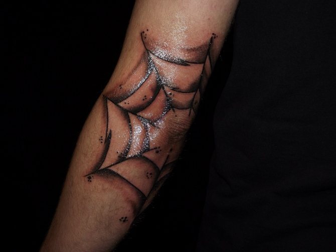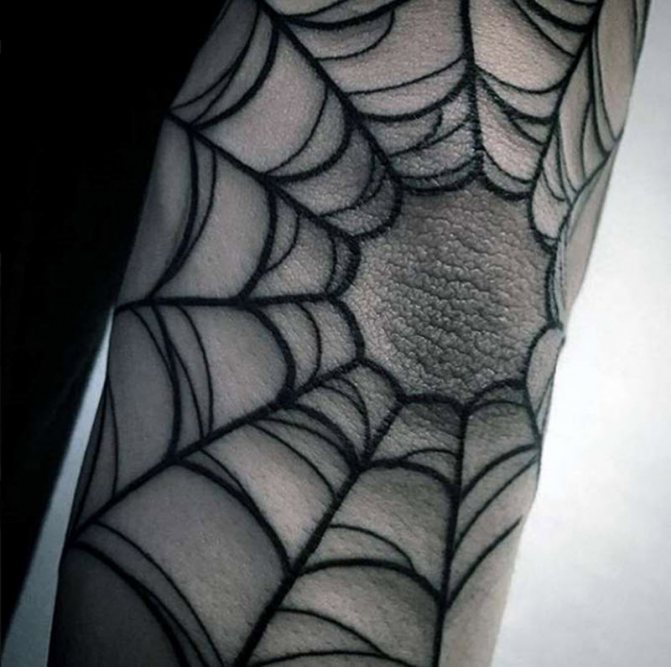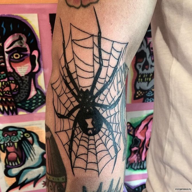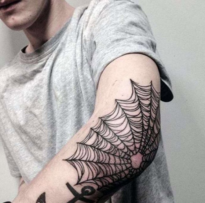 Cabe destacar que en los hombres esta imagen es mucho más frecuente que en las chicas. Este tatuaje puede servir como elemento independiente, por ejemplo, una tela de araña en el codo. Pero a veces se utiliza como parte de la composición, complementando o destacando otros elementos de la imagen. El tatuaje en el codo del hombre estará en constante movimiento, simbolizando la brutalidad y el peligro de su portador.