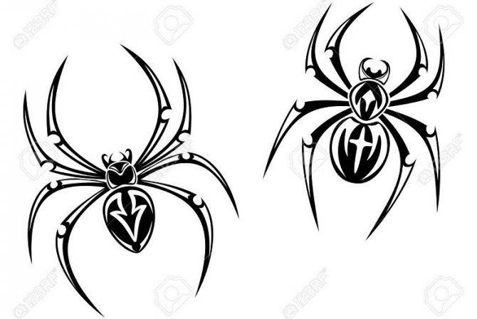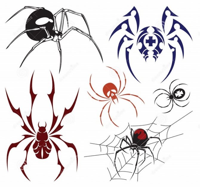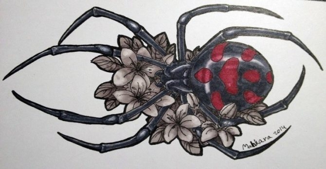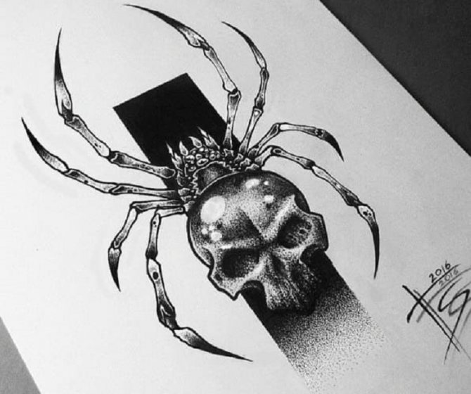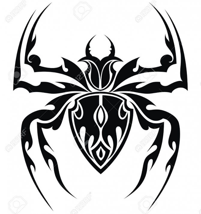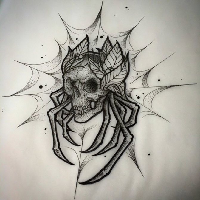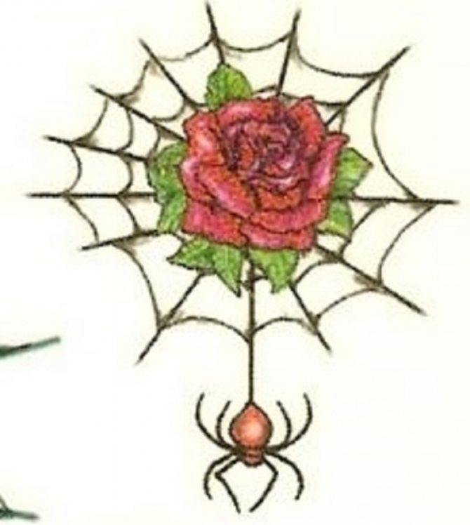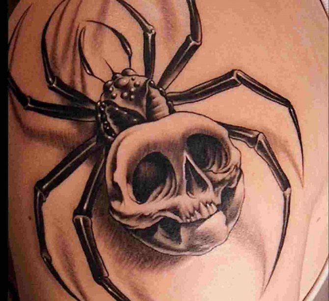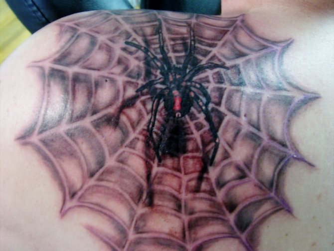 Cabe destacar que en los hombres esta imagen es mucho más frecuente que en las chicas. Este tatuaje puede servir como elemento independiente, por ejemplo, una tela de araña en el codo. Pero a veces se utiliza como parte de la composición, complementando o destacando otros elementos de la imagen. El tatuaje en el codo del hombre estará en constante movimiento, simbolizando la brutalidad y el peligro de su portador.