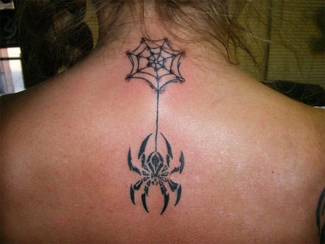 El tatuaje de tela de araña en el cuerpo de una chica es un testimonio de la gentileza y la libertad del sexo débil. Por eso este tatuaje lo usan las chicas con un estilo de vida libre. Para resaltar su independencia a la imagen puede ser una motera, una mujer que es inamovible en sus decisiones, teniendo un carácter audaz, decidido y de fuerte voluntad.