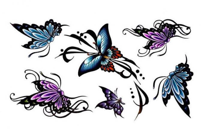 Las mujeres prefieren imágenes brillantes con flores. Composiciones populares de tres mariposas en vuelo. A veces los insectos se complementan con una dispersión de estrellas, si la persona está en busca de un camino de vida. Las mariposas suelen ser la primera imagen que aparece en el cuerpo de una dama. Al fin y al cabo, simbolizan la feminidad y la belleza.