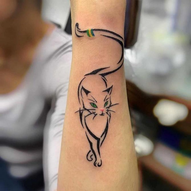 Ejemplo de tatuaje minimalista. El gato está representado de perfil. Todo su cuerpo está hecho en negro, pero los detalles están representados en color.