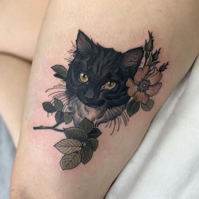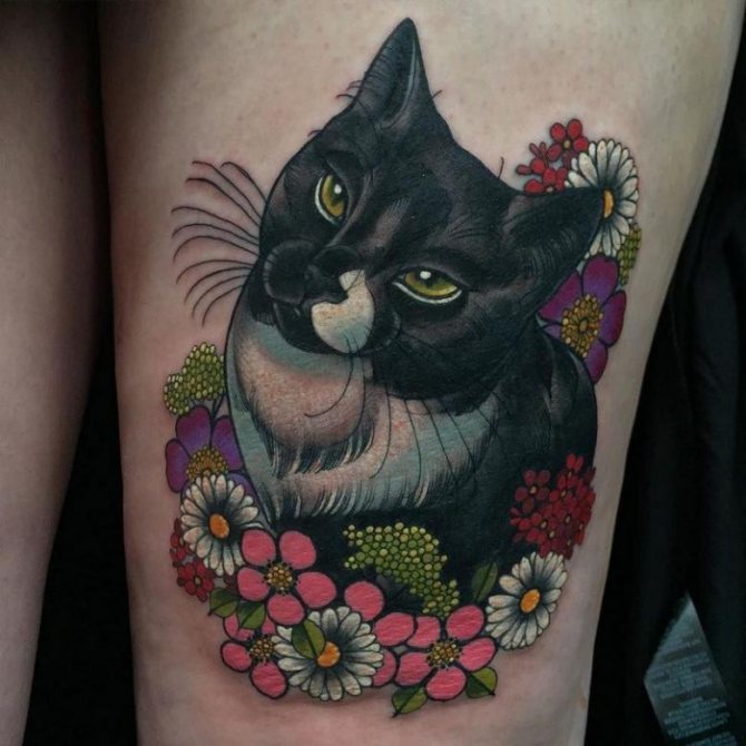 La imagen del gato Behemoth (El maestro y Margarita) no es menos demandada. La categoría de edad para este tipo de tatuaje es difícil de definir. Las imágenes irónicas son más atractivas para los jóvenes, y la imagen de un gato sedoso atrae a los hombres maduros.