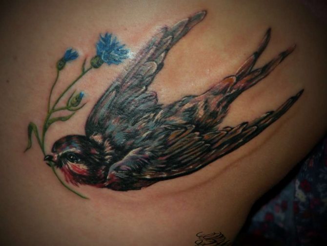 Las chicas también son muy aficionadas a estos tatuajes. El significado para ellos sería: primavera, juventud y belleza. Este pájaro también se representa con un pico con una flor. Una chica con este tatuaje será atractiva y encantadora. Las personas elegantes y románticas prefieren una golondrina de cintura, con la que resultan tan seductoras al mostrarlas coquetamente.