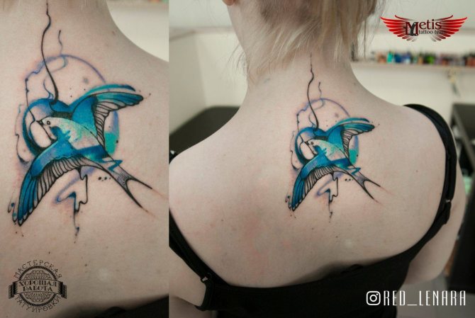 A los hombres modernos les gusta tener grandes golondrinas en la espalda, los brazos y el pecho. Se cree que el pájaro en el cuerpo trae éxito y buena suerte.