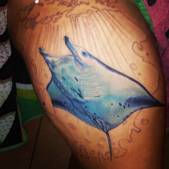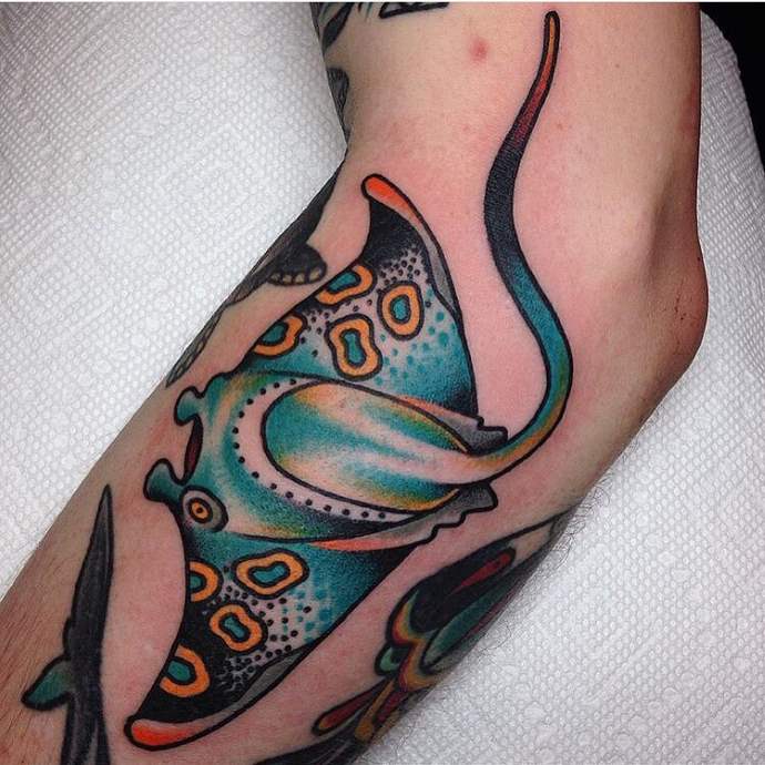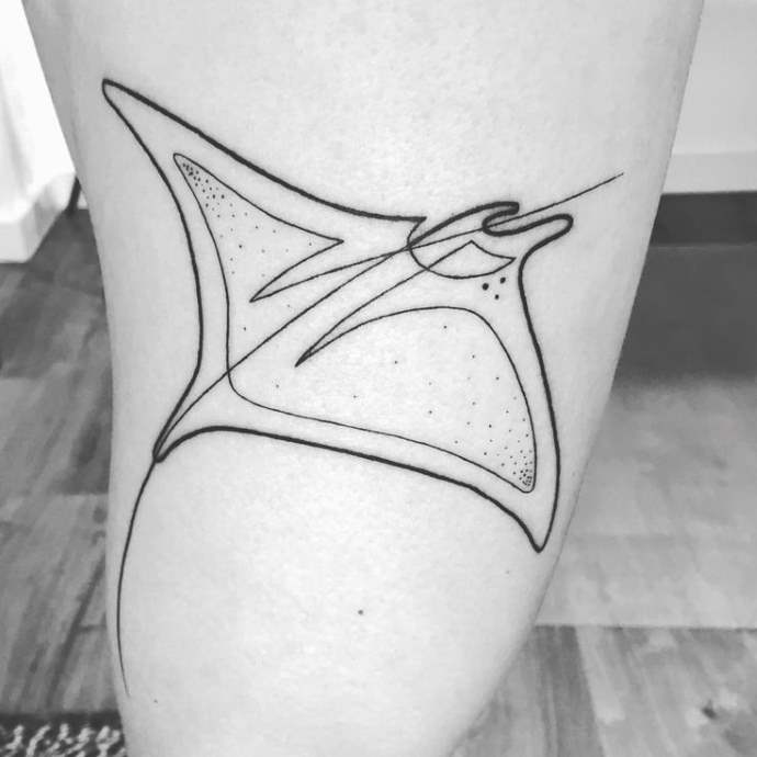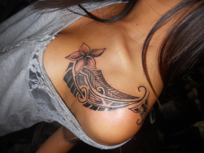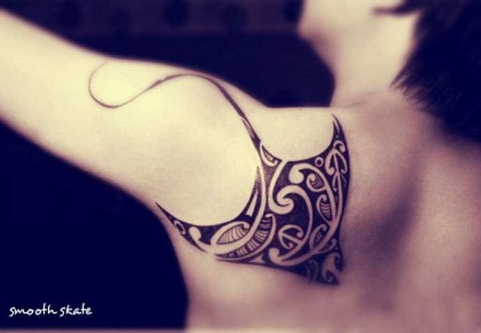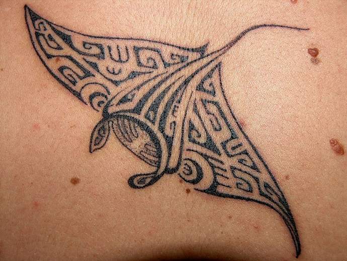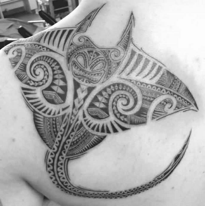 El estilo polinesio será el más apropiado para las imágenes de temática marina. Los bocetos tienen un aspecto espectacular gracias a los caprichosos patrones y adornos. La composición suele hacerse en la misma combinación de colores. Al color negro se le puede añadir rojo o tonos de marrón. Un tatuaje de este tipo será igual de bonito a gran escala que a pequeña escala. El tatuaje con una raya en la espalda será una atractiva decoración corporal y un talismán para su dueño. La imagen también puede realizarse en una pierna, un pie o una mano.