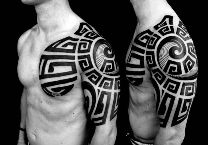 | En los hombros y el antebrazo | Los dibujos con signos situados en esta zona del cuerpo señalan una personalidad fuerte y valiente. Los motivos de las mangas suelen consistir en bloques rellenos de formas geométricas. |