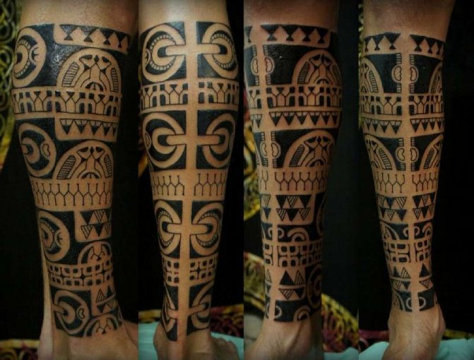 - La pierna está decorada con anchas tiras de adorno, en el centro de las cuales se entrelaza un disco del sol, que termina con el tatuaje en la base de los dedos del pie;