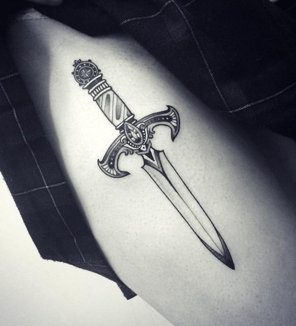 Un arma sobre un fondo defensivo es un símbolo de la nobleza del alma de un verdadero guerrero. Un tatuaje de espada y escudo suele ser elegido por hombres que han vinculado su vida al ejército o a una causa militar.