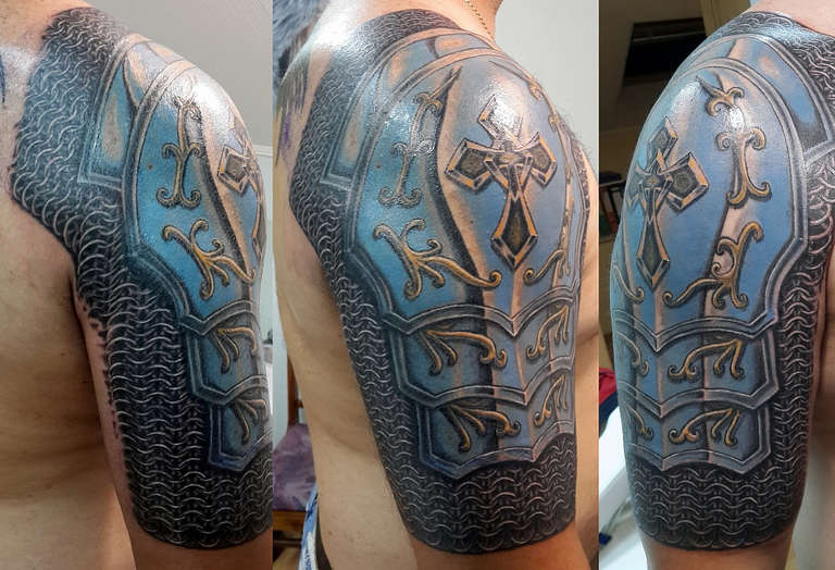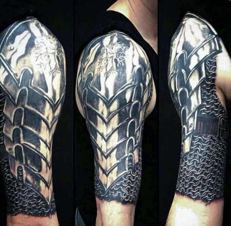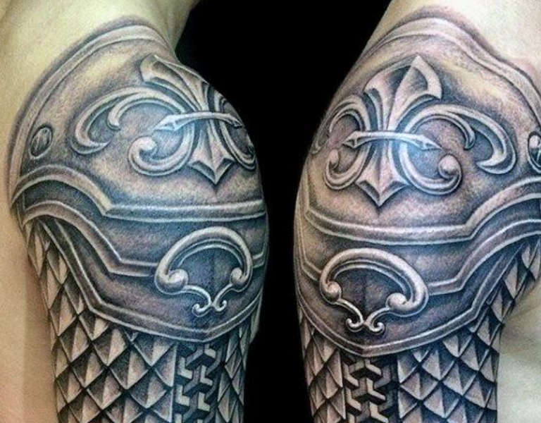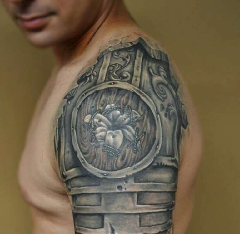 El propietario de un linaje distinguido subraya su pertenencia a una familia famosa decorando su cuerpo con un tatuaje que representa un escudo. La armadura antigua muestra el escudo de la familia, un lema o la conmemoración de las hazañas de un antepasado. Este arte corporal atrae a los hombres de carácter belicoso, a los amantes de las tradiciones históricas, a los conocedores de la caballería.