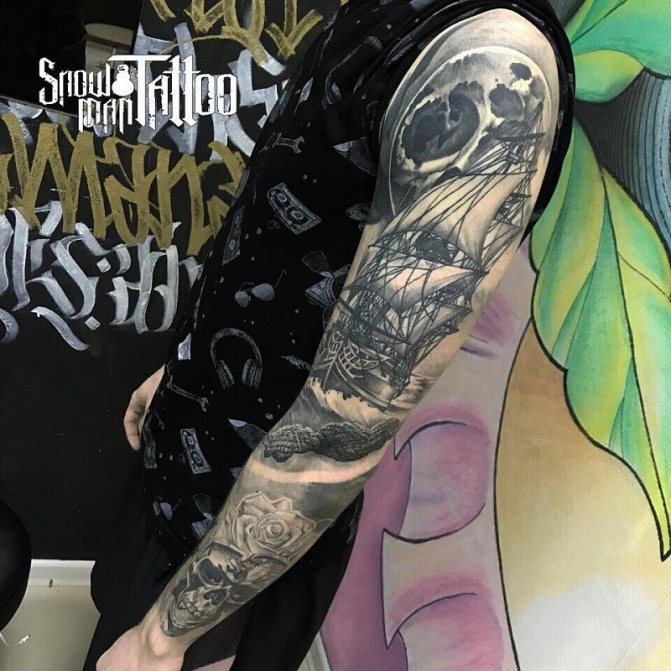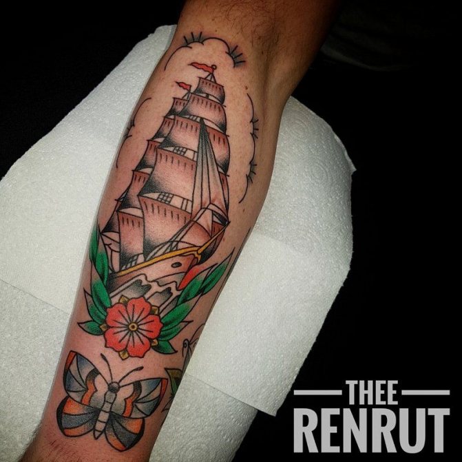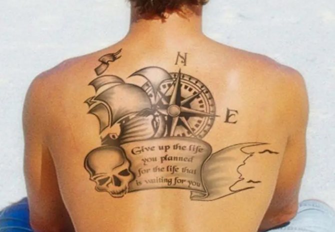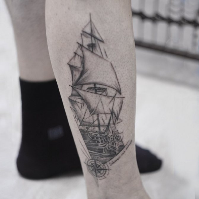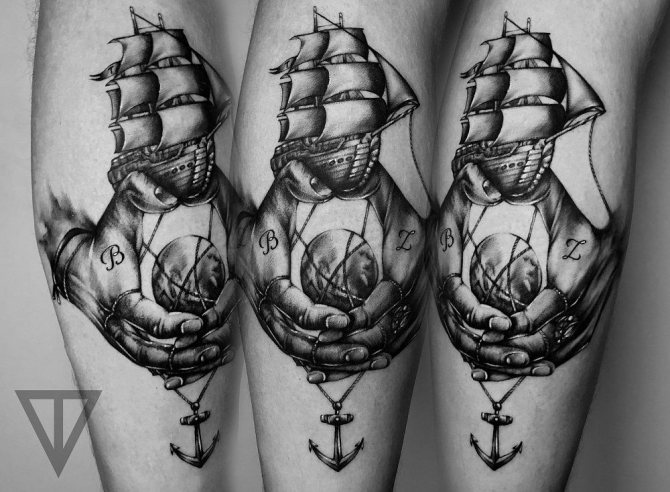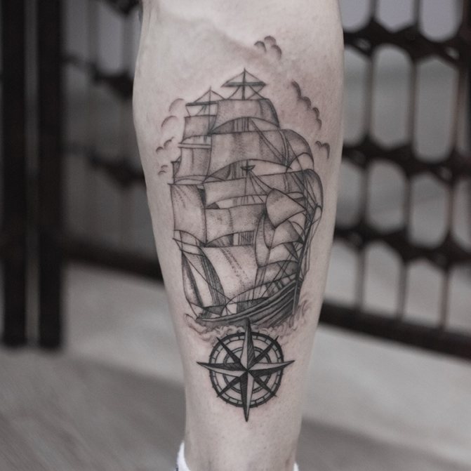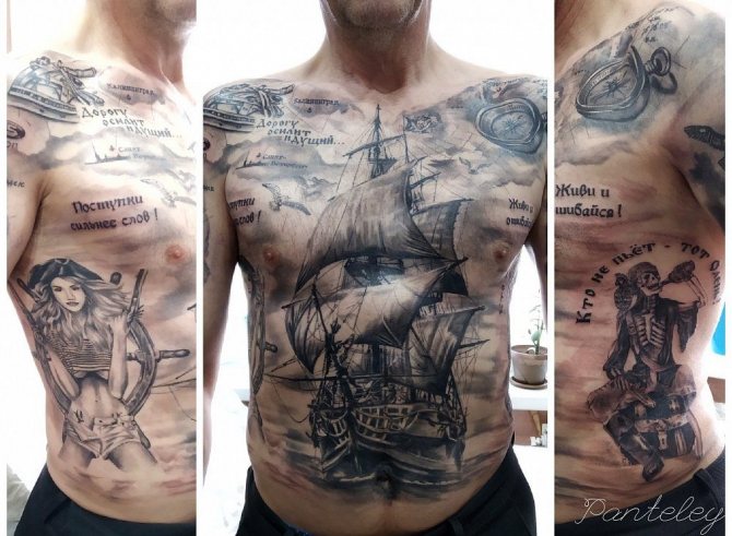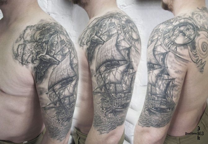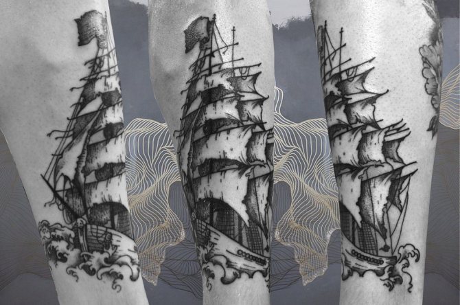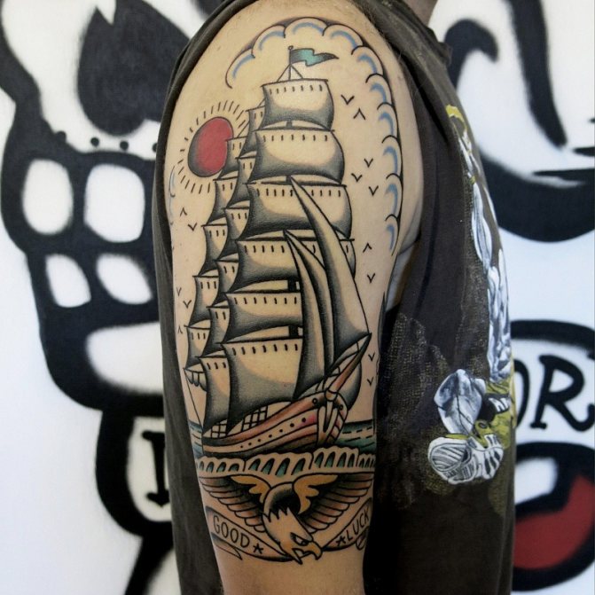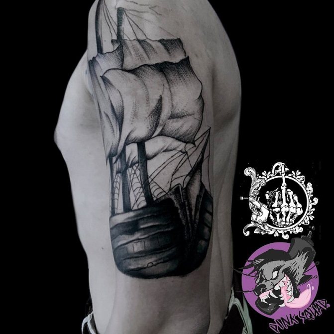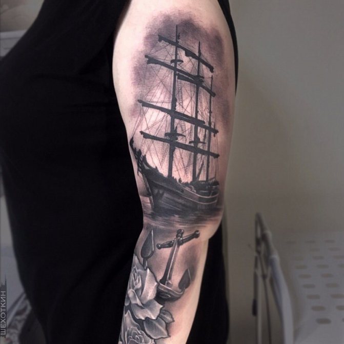 Los miembros del sexo fuerte se refieren a estos tatuajes como un talismán. La imagen puede hablar de la pertenencia de su propietario en el pasado o en el presente a la marina o demostrar su disposición a proteger su patria y a sus seres queridos, especialmente si el tatuaje representa un buque de guerra. El dibujo de una embarcación marítima luchando contra los elementos durante una tormenta simboliza la intrepidez. El dueño de un boceto así no teme las pruebas de la vida y logra su objetivo con confianza. Si el cuerpo de un hombre es la imagen de un barco navegando con velas blancas, significa que eres una persona creativa, siempre dispuesta a la aventura. La bandera pirata, como detalle añadido al diseño, representa la falta de voluntad de su propietario para obedecer las leyes y las normas.