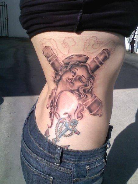 Los tatuajes con numerosos y pequeños atributos son la prerrogativa de las bellas damas. El diseño femenino más común es la imagen de un barco con velas escarlatas, que indica la naturaleza amable, sensible y romántica de la propietaria del tatuaje. La imagen de un barco con un ancla en el cuerpo de una mujer habla de la dedicación y la devoción a su familia. Un ancla es también un símbolo de estabilidad. No es raro que las jóvenes se apliquen estos tatuajes en señal de respeto a sus maridos que son marineros. Los dibujos de esta naturaleza significan paciencia y lealtad. Una goleta elegante con dibujos o líneas fluidas indica la ensoñación de una bella dama. A menudo no es seria y suele tener la cabeza en las nubes. Una estrella sobre cubierta en el tatuaje de una mujer es símbolo de fe en el futuro y de un deseo irresistible de alcanzar su meta.