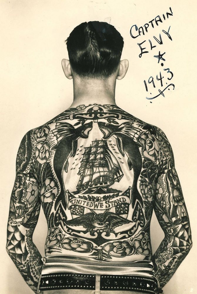 El capitán Alvy, que trabajaba en el circo, muestra su hermosa espalda diseñada por el "marinero" George Fosdick.