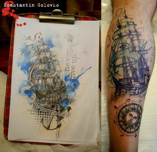 Llevar joyas con la imagen de un barco naval tiene muchas variantes de ejecución. Si echas un vistazo en Internet o ves fotos del trabajo terminado en cualquier salón de tatuajes, lo comprobarás por ti mismo. Además de los conocidos bocetos de libros de arte y modelos de barcos de las películas, encontrará numerosos diseños individuales. Esto significa que puede optar por un tatuaje prediseñado o crear uno usted mismo.