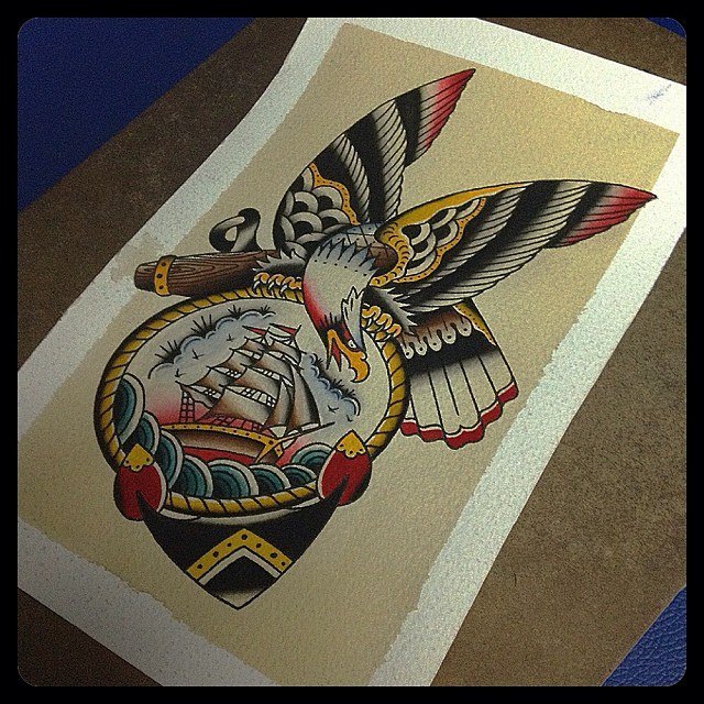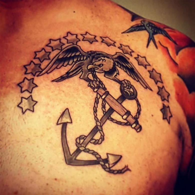 Normalmente, los tatuajes de la Marina se aplican en el hombro o en la mano. Las imágenes incluyen: