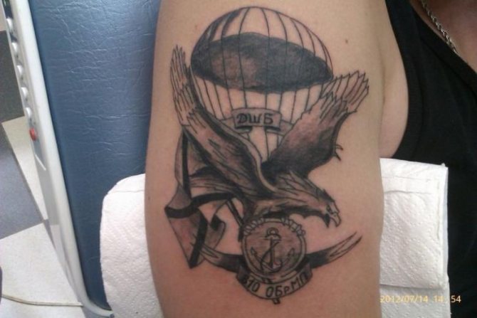 Además, los tatuajes de VDV en el hombro se complementan con inscripciones muy especializadas, siendo las más populares: "Nadie más que nosotros" y "Al aire". Por regla general, las personas que no pertenecen a la élite del ejército no encargan este tipo de arte corporal. Los antiguos militares acuden a los tatuadores para retocar el contorno de las imágenes que se han desdibujado con el tiempo, o para afinar la composición. Otras versiones del tatuaje Airborne pueden incluir una calavera con boina sobre un fondo de fuego, un tigre, un lobo, otros animales fuertes y siempre dispuestos a atacar.