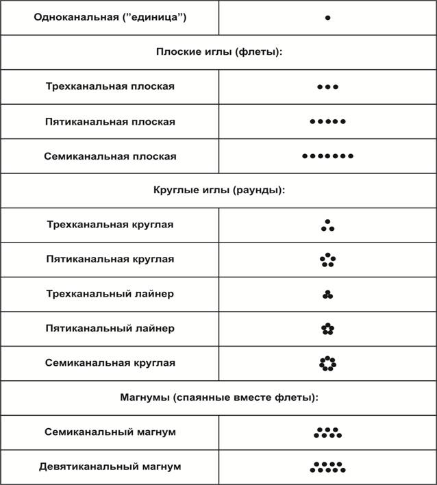 Los dos primeros dígitos son los diámetros de las agujas (12-0,35mm, 10-La tercera y cuarta cifras indican el número de agujas de la fusión. Letras al final: RL - Roundsigner, RS - roundscheider, M1 - magnum, М2 - doble flota, F - folleto, RM - roundmagnum si se añade al final Т - significa que las agujas son texturizadas (consideradas las más eficaces para pintar) ejemplo: 1209 RMT - Magnum redondo de 9 agujas texturizadas de 0,35 mm de diámetro cada una. 1213 RL - contorneada, ensamblada con 13 agujas de 0,35 mm de longitud.