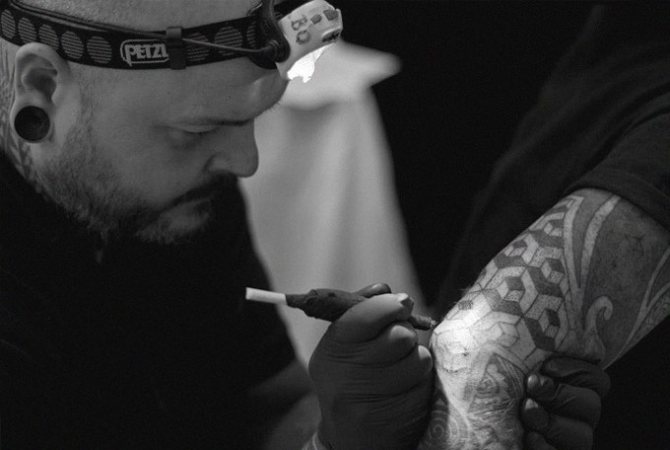 Después de esto comienza el proceso de tatuaje propiamente dicho. Los maestros del tatuaje dan preferencia a las máquinas que funcionan con electricidad. El diseño es claro y homogéneo. Estas máquinas minimizan el daño a los vasos sanguíneos y causan mucho menos dolor al cliente que otras máquinas. ¿Qué tipo de quejas puede tener el cliente? La única queja es una ligera sensación de hormigueo en la zona del dibujo.