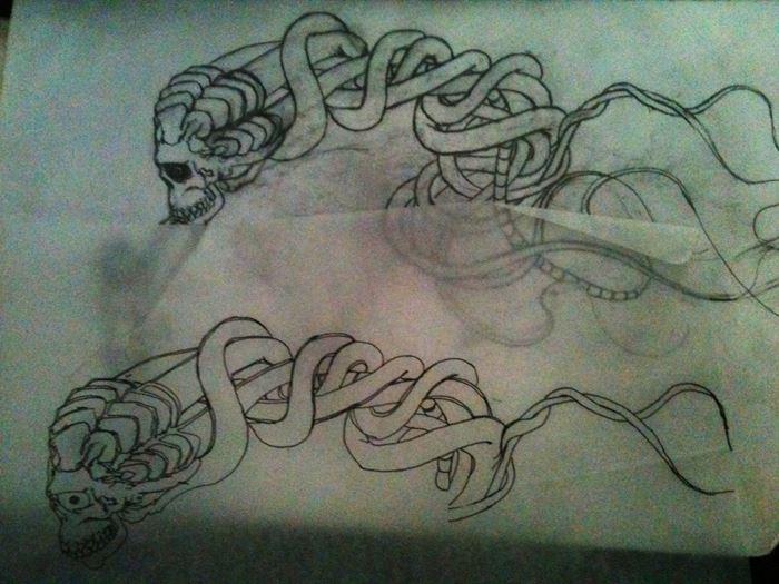 Para transferir un boceto de una imagen en el cuerpo, se transfieren los contornos de la imagen al papel de calco. La impresión resultante se aplica a la piel, se unta con un compuesto especial y se imprime la imagen. Los contornos sobre los que el maestro va a tatuar se dejan en la piel.