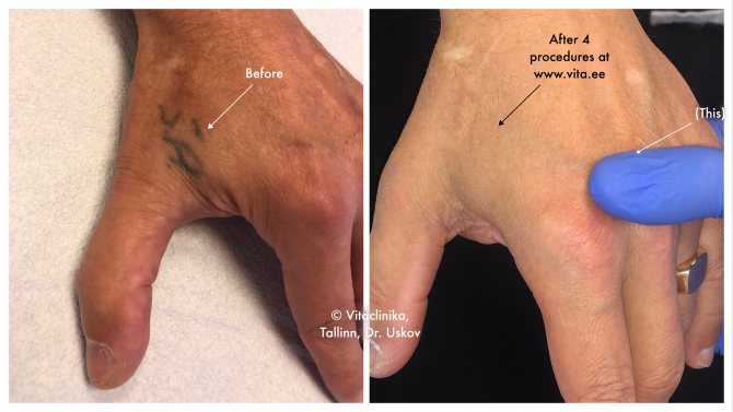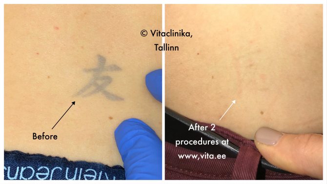 Se formará una gran úlcera después de la manipulación. Se lava suavemente con agua hervida tibia y se unta con una crema curativa (por ejemplo, Spasatel). Una vez que la herida se ha curado, se repite el tratamiento. Repita el tratamiento hasta que el tatuaje haya desaparecido por completo.