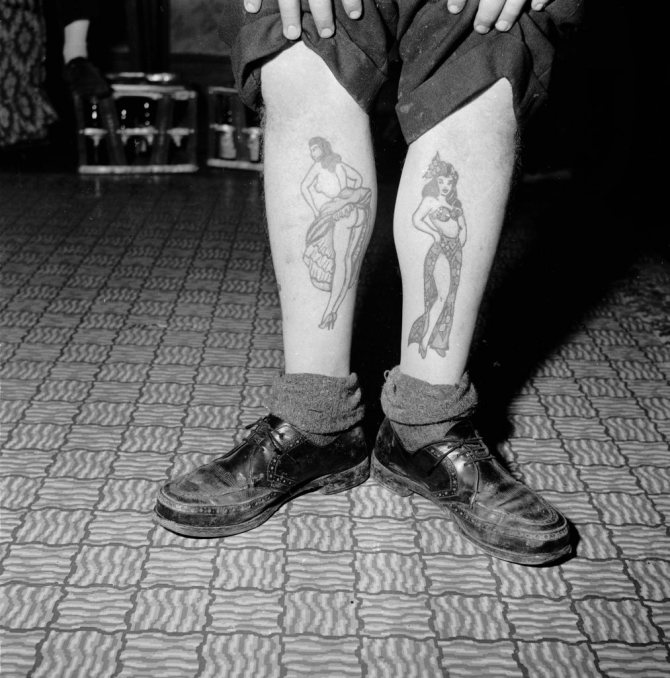 Los tatuajes de los marineros eran totalmente distintivos. Estos diseños, una especie de salpicadura, es decir, un tipo de arte popular, se basaban en imágenes fácilmente legibles, como el nombre o el rostro de una madre (o mujer amada). Los símbolos cristianos, como las cruces, los rosarios y la silueta de la Virgen María, eran un motivo frecuente: al igual que los cruzados, los marineros eran perdonados por la iglesia por tomarse libertades con sus cuerpos y los propios símbolos sagrados.