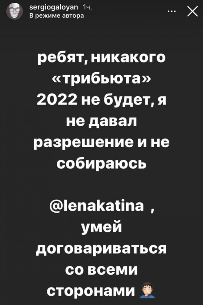 - Chicos, no habrá ningún "homenaje" de 2022, no he dado mi permiso y no lo voy a hacer. Lena Katina, sabe negociar con todas las partes", escribió Sergey Galoyan en su Storis.