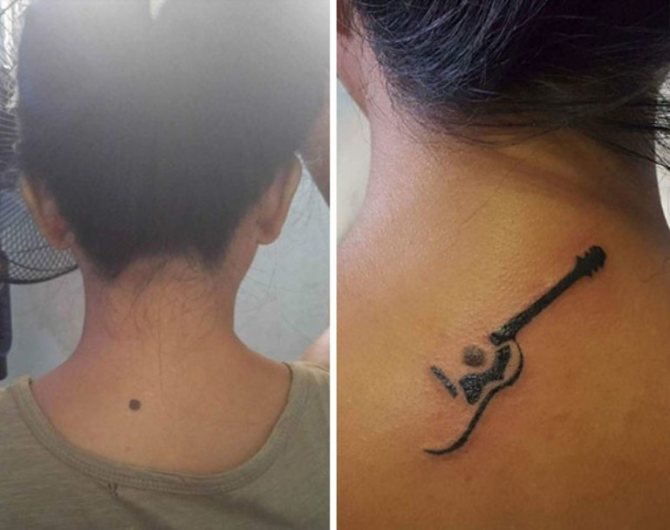 Si tienes un lunar en la piel, elige correctamente la forma y la colocación del diseño, un requisito previo para los dermatólogos cuando se trata de tatuajes. Un artesano hábil elegirá un boceto, rodeará el lunar sin tocarlo o hará la marca armoniosamente en el cuadro. El diseño debe estar al menos a 5 mm de distancia del nevus. Las células pigmentarias pueden estar en la formación, en áreas adyacentes de la piel sana, esto debe ser tenido en cuenta.