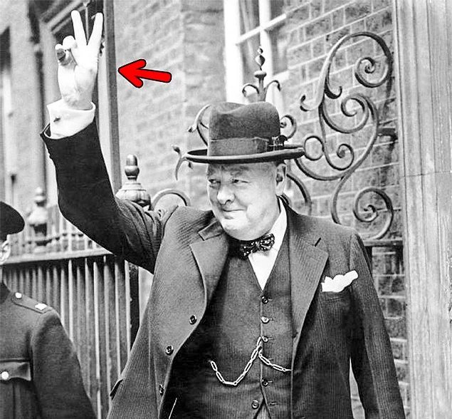 Según otra versión, el gesto se originó durante la Segunda Guerra Mundial con su tradicional significado de victoria. Winston Churchill utilizaba mucho este gesto y se convirtió en un elemento de la cultura popular.