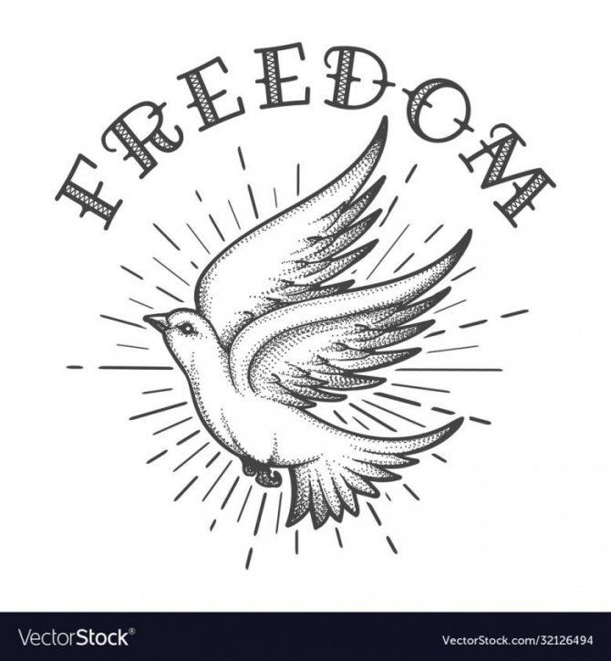 La libertad es la capacidad de moverse en cualquier dirección. Para los pájaros, no hay fronteras ni obstáculos, pueden volar a diferentes países. Para demostrar el deseo de libertad, se tatúan en el cuerpo diversas aves con la parafernalia asociada: plumas, alas.