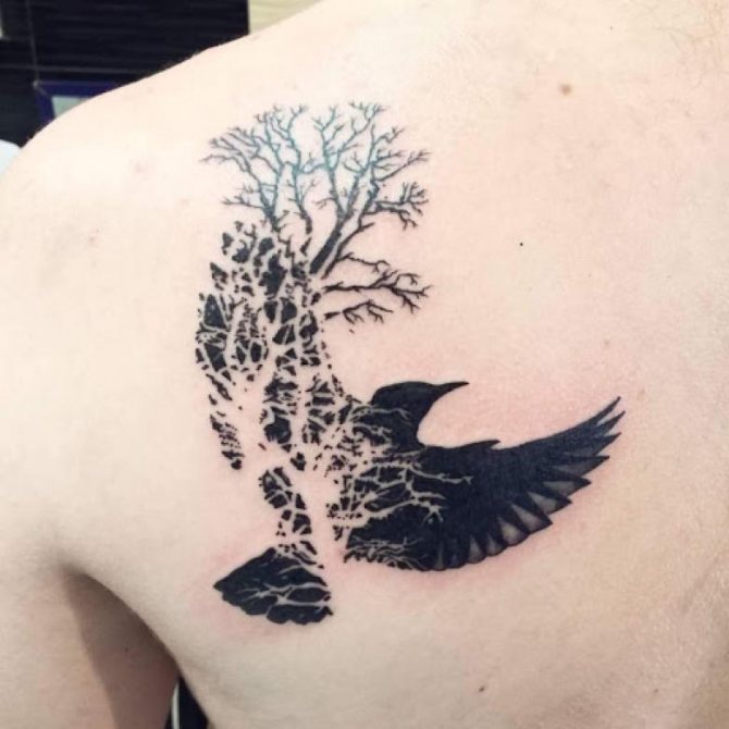 - Raven - es un pájaro sabio y solitario que representa la búsqueda del conocimiento, la búsqueda de su camino. El tatuaje de un cuervo que simboliza la independencia es muy popular entre los hombres.