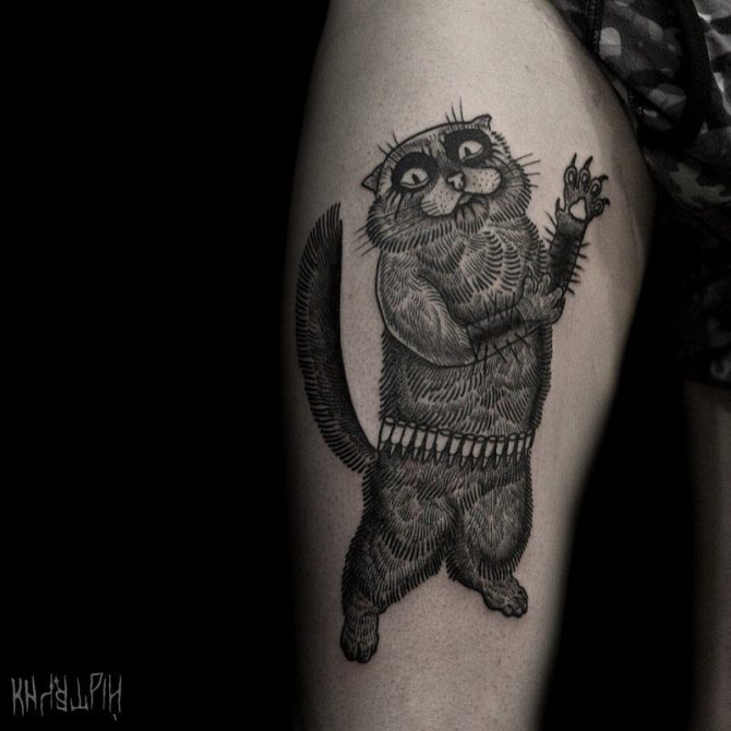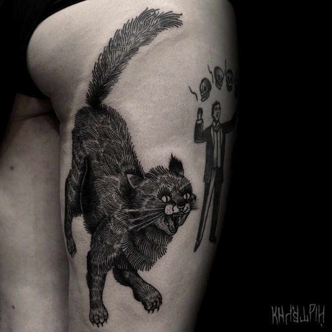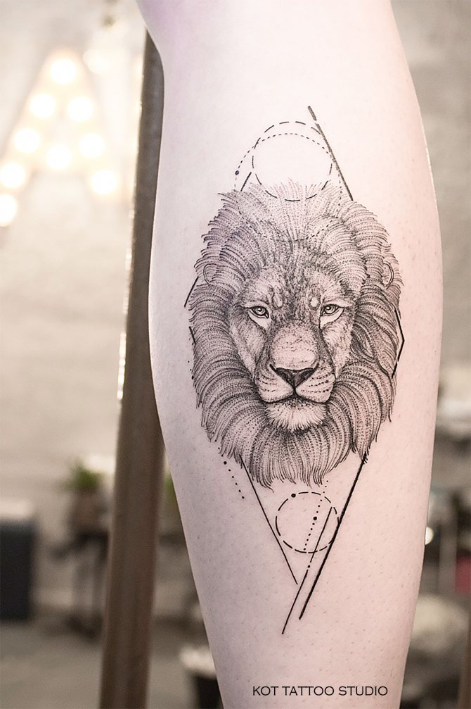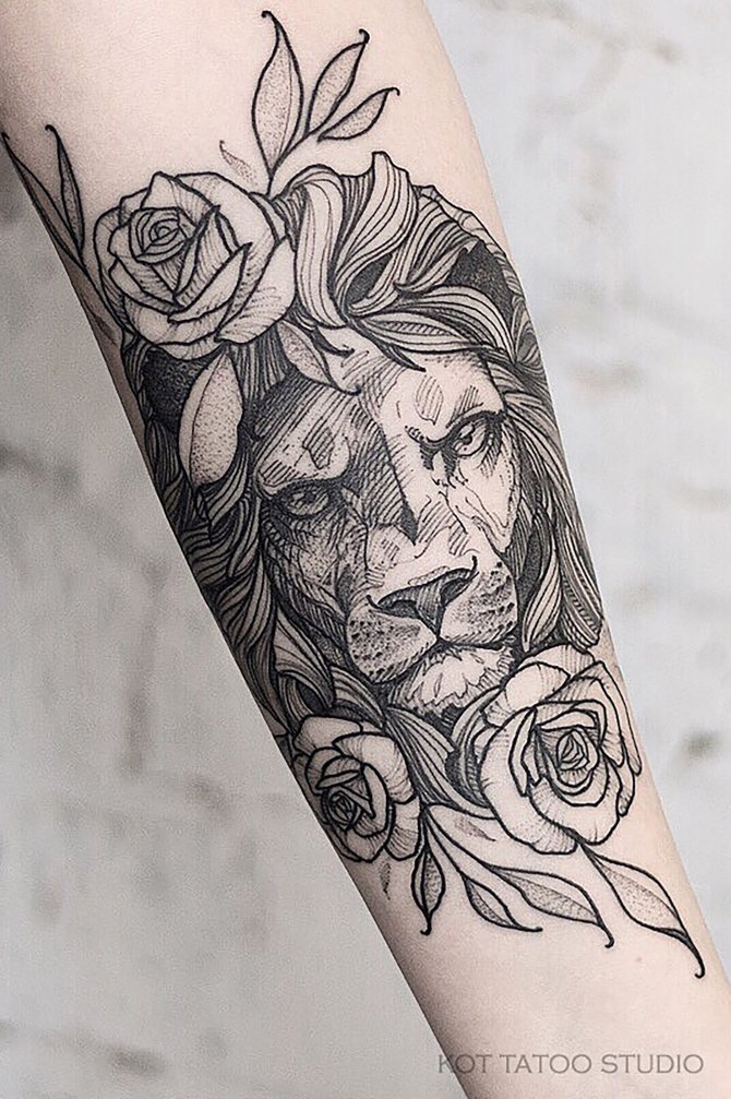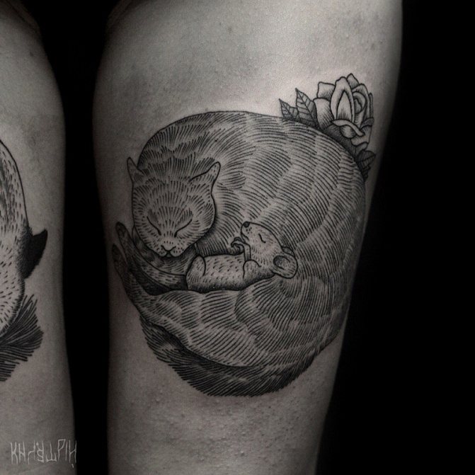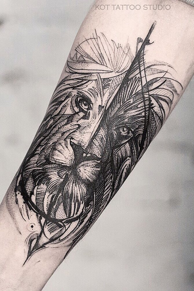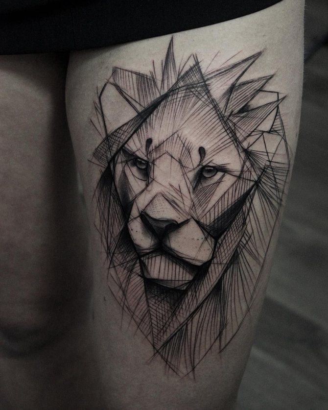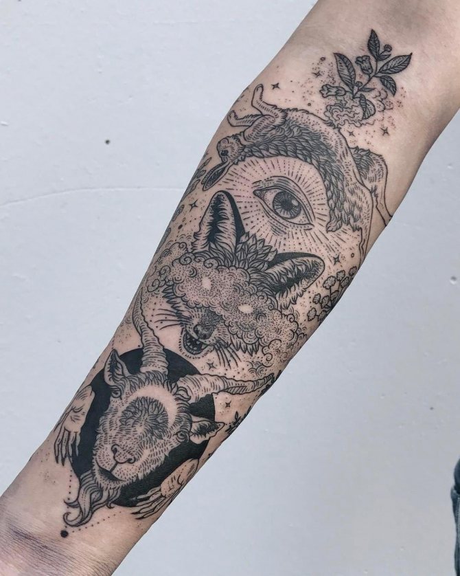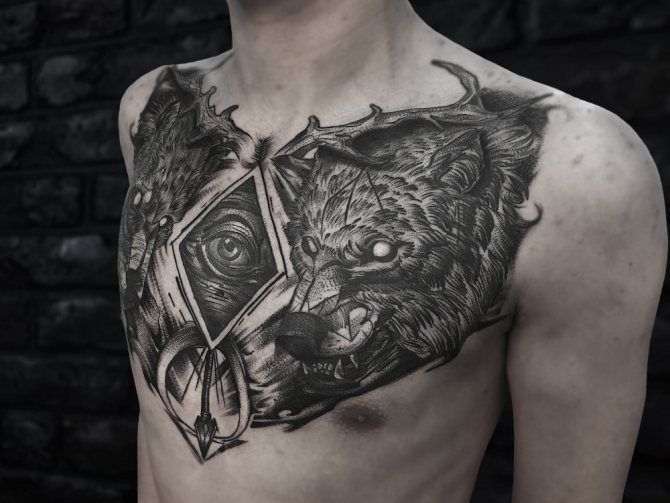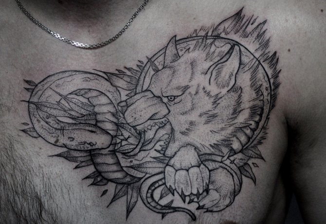 Los ojos del lobo resaltados indican dolor y soledad. Los bocetos con la imagen del rey león de las bestias caracterizan al propietario como una persona segura de sí misma que hace frente a todas las dificultades en solitario. El mismo significado se aplica a los tatuajes con dragones míticos.
