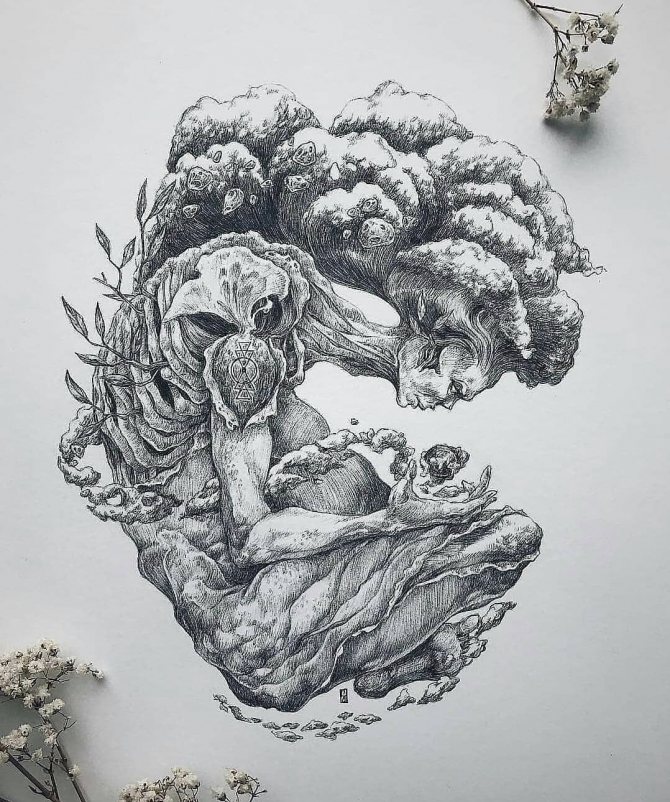 - Bocetos perfectamente combinados con el gótico (bosque negro con un contorno esquemático de los abetos o imagen en forma de trazos perfectamente precisos del cráneo).