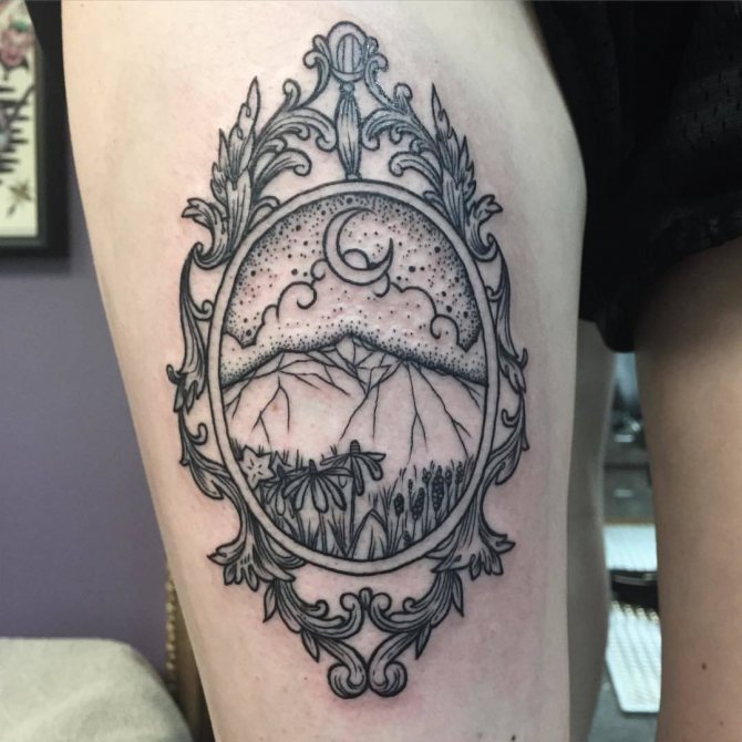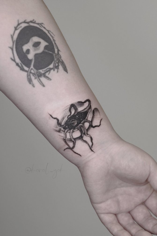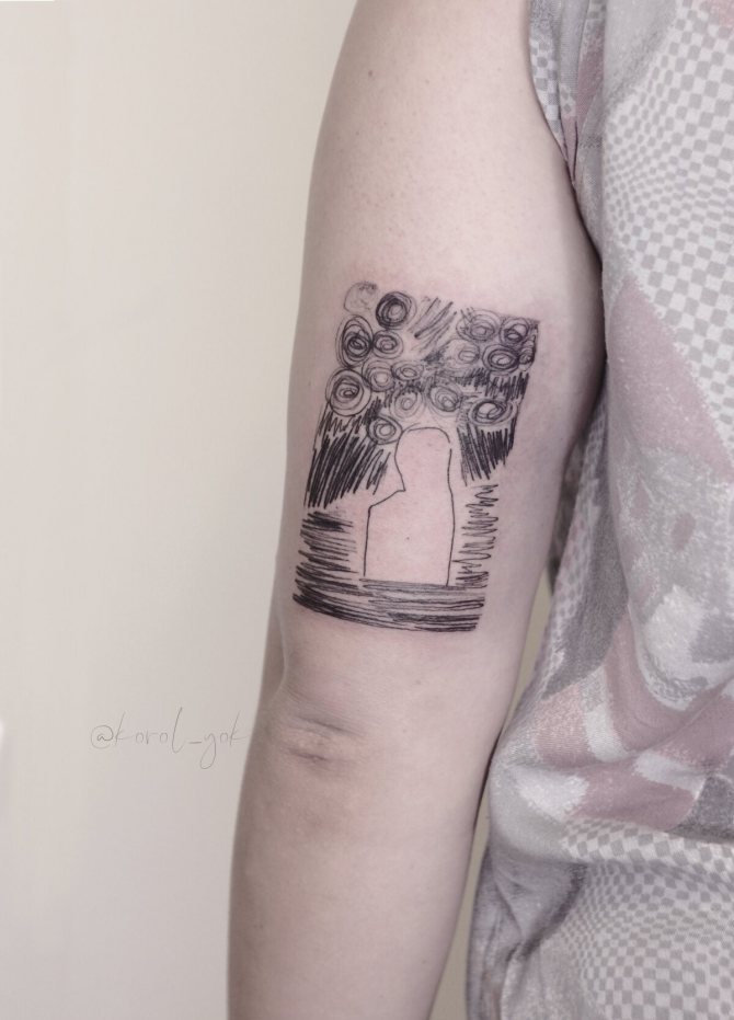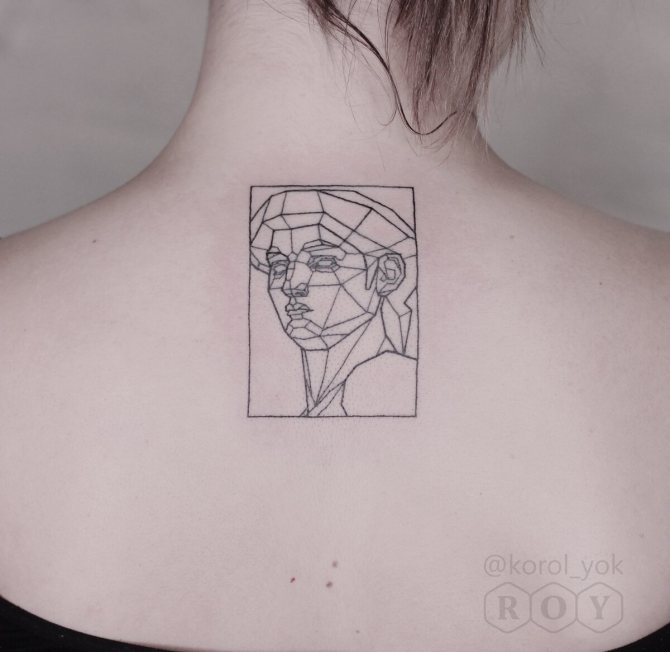 Más arriba en el material mencionamos una cierta peculiaridad de dicha técnica, que depende en gran medida de la elección de la ubicación del tatuaje. Las líneas claramente dibujadas que se utilizan en los diseños deben colocarse en zonas del cuerpo donde no se refracten ni se doblen. Esto implica que lo más apropiado es aplicar el gráfico del tatuaje en el hombro, el antebrazo, la cadera, la espalda o cualquier otra zona del cuerpo en la que la parte objeto del boceto no esté en movimiento. Las composiciones esquemáticas y los dibujos volumétricos, respectivamente, deben situarse en zonas más amplias, como el torso o la espalda. Para los retratos y las imágenes más pequeñas, lo ideal son los hombros, los antebrazos, los omóplatos, el pecho o los muslos. Los diseños discretos quedan bien en los brazos. El minitatuaje puede adornar cualquier parte del cuerpo y puede utilizarse en los dedos, detrás de la oreja, en el cuello, en la mano o en el pie.