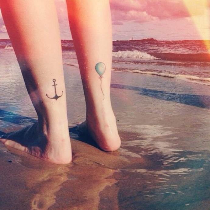 Para el sexo débil se hará el tatuaje en el estilo de la acuarela. Es una de las técnicas más comunes y se caracteriza por la ligereza y la fluidez de las líneas. Los colores saturados y los contornos difuminados dan al globo un aspecto ligero y atractivo. Un pequeño y colorido tatuaje quedará bien en la escápula, la muñeca, la espinilla o el tobillo y resaltará la gracia y la fragilidad de su dueño. El motivo puede basarse en un conjunto de globos de colores que vuelan hacia el cielo. Muy femenino se verá tatuaje, decorado con flores.