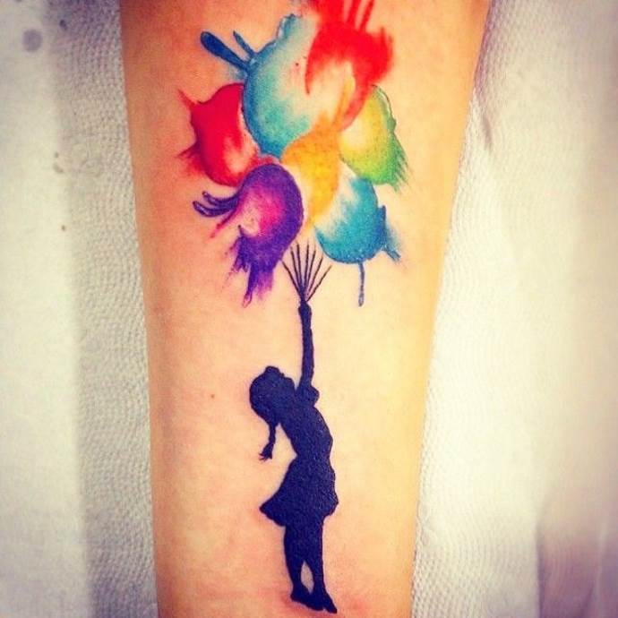 Un globo de acuarela tendrá un aspecto original. Casi todos los trabajos realizados en este estilo evocan pensamientos de ligereza y ligereza, mientras que los colores vibrantes acentúan la individualidad. Un tatuaje de acuarela hablará de tu ensoñación, de tu tendencia a la creatividad y a la reflexión.