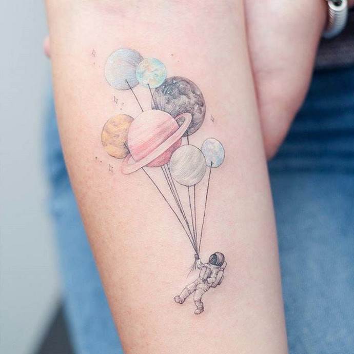Un tatuaje de varios globos es común entre las chicas. Este tipo de arte corporal refleja la ensoñación y la espontaneidad infantil del propietario. El globo grande para niñas simboliza la alegría y la armonía interior. Las mujeres eligen diseños pequeños y coloridos y los aplican principalmente en los brazos, los hombros y el cuello.