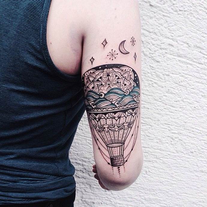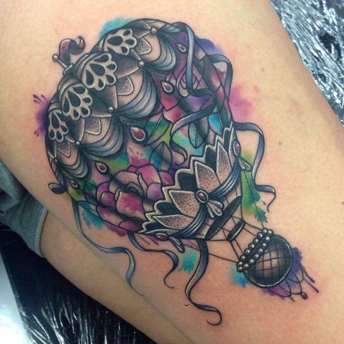 Mira interesante trabajo en el estilo de ornamental. Este estilo suele realizarse de forma simétrica y con muchos detalles. Este tatuaje tiene un aspecto inusual, incluso en monocromo. El propio globo puede decorarse con un adorno. Los bocetos de los globos, realizados en forma de mandalas, pueden encontrarse en la red. Un mandala, que simboliza la integridad del universo y la interconexión de todos los aspectos de la vida, va bien con la ligereza de un globo. El significado simbólico del mandala es el de una persona plácida, tranquila y serena, pero al mismo tiempo soñadora y exploradora de nuevos conocimientos y percepciones. El significado principal del diseño es que el artista es un filósofo que busca la armonía consigo mismo y con el mundo; una persona con un fuerte sentido de la creatividad.