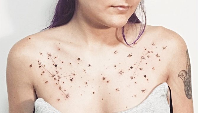 El tatuaje del cielo estrellado también aparece en la escápula. En esta zona se puede aplicar cualquier tipo de diseño: pequeño, tridimensional, de color, negro. La ventaja de un tatuaje en la escápula es el proceso de dibujo indoloro. Hay menos terminaciones nerviosas en comparación con el tobillo o la muñeca.