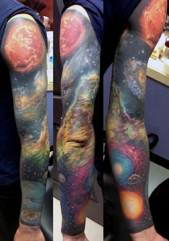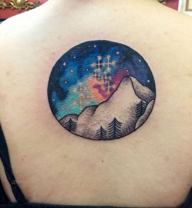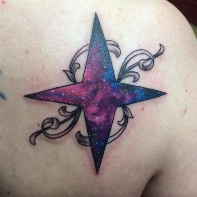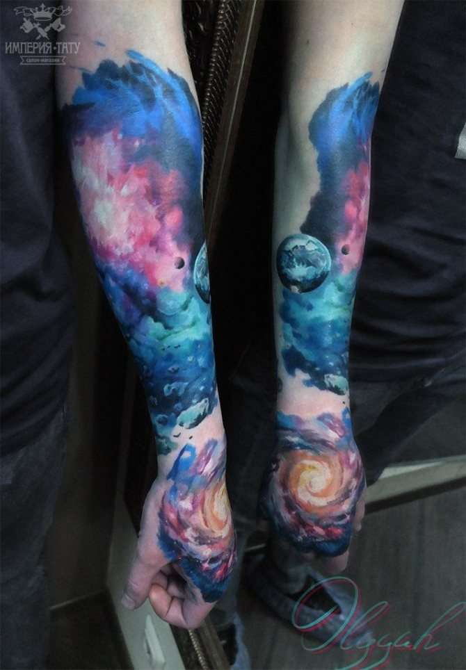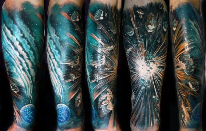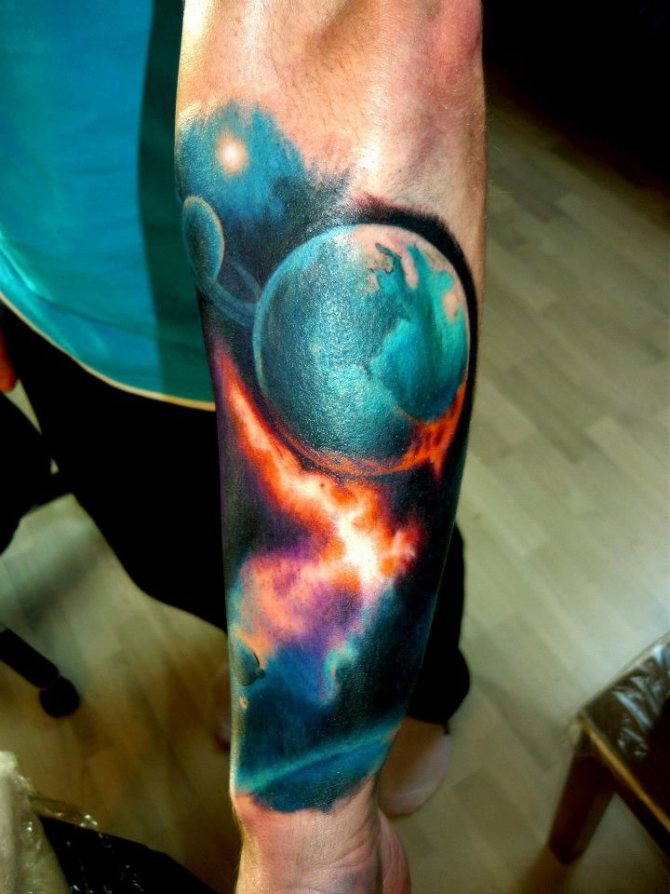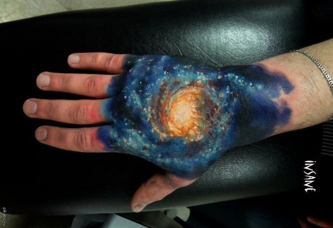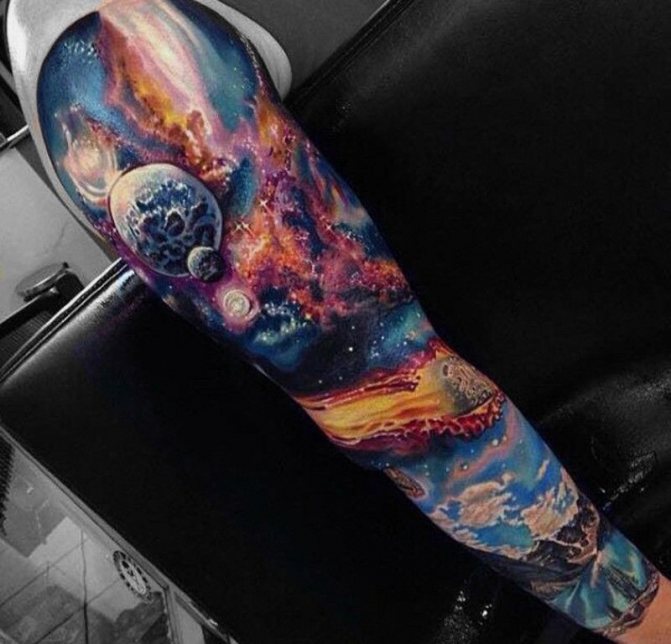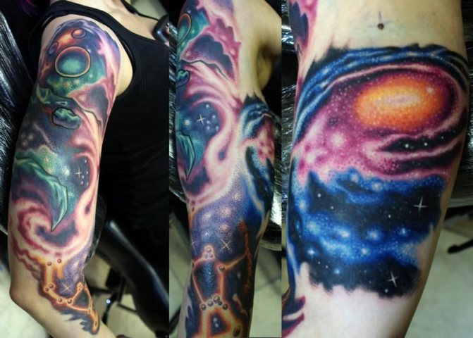 Si un maestro transmite hábilmente el juego de sombras, el brillo de las estrellas y el cosmos, el cuadro se llenará de colores que están en el mismo sector cromático. Este es el tipo de diseño que hace que el tatuaje parezca hermoso y noble.