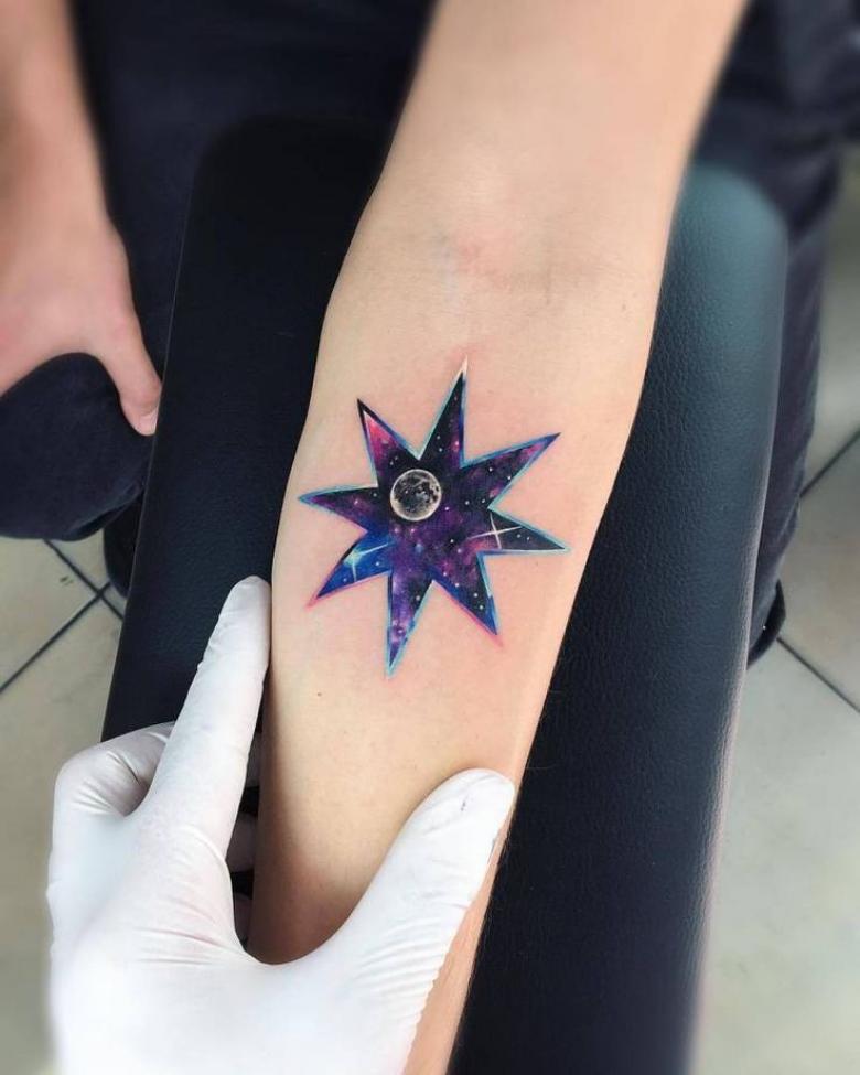 Esta parte del brazo destacará maravillosamente gracias al tatuaje. Es menos doloroso obtener un patrón en esta zona que en otras áreas del cuerpo. Los antebrazos son capaces de producir un boceto de buena calidad y detallado con muchos detalles finos. Esto es importante para un tatuaje de cielo estrellado.