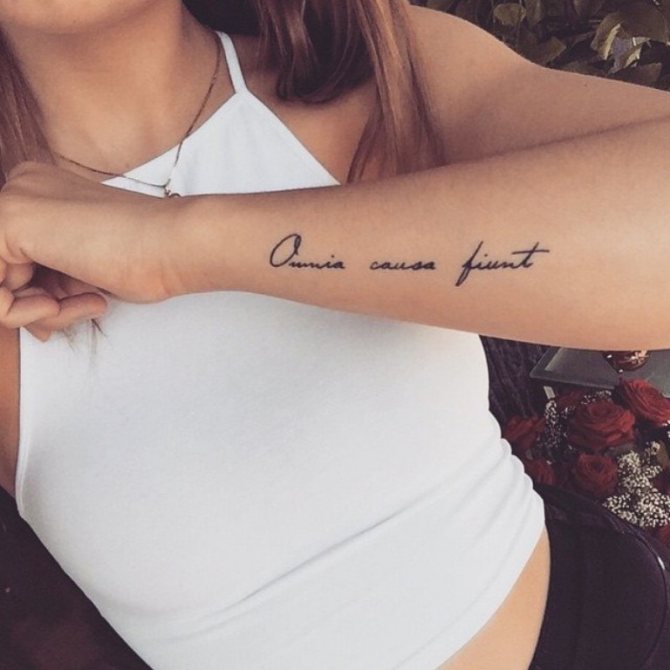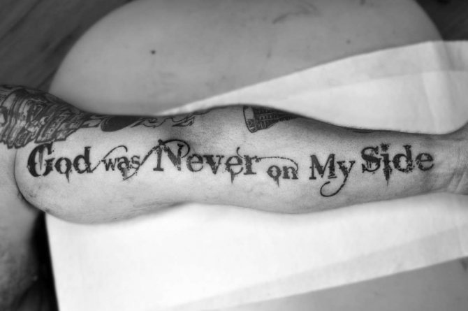 Las pequeñas citas y aforismos quedan bien en el hombro y el antebrazo. Se pueden complementar con pequeños dibujos o símbolos. O hacer un bonito fondo para la inscripción. Las composiciones de los hombres en el brazo parecen más agresivas y tienen un mensaje diferente al de las mujeres.