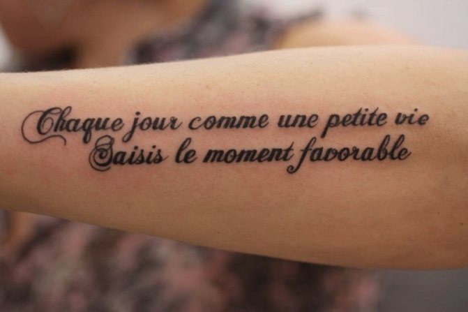 - Confianza en sí mismo. Estoy de acuerdo en que el apoyo es muy necesario en tiempos difíciles. Las citas de tatuajes para la motivación personal son utilizadas activamente por chicos y chicas por igual. Ejemplos: Je vais au rêve (francés) - Voy hacia mi sueño, Jouis de chaque moment (francés) - Disfruta de cada momento;