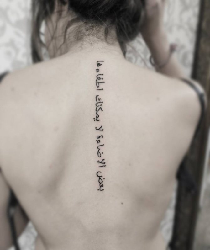 Tatuajes temporales. Más a menudo a los tatuajes temporales pertenecen los representantes del bello sexo. La característica del tatuaje es que con el tiempo se borra. Algunas chicas siguen prefiriendo los dibujos de henna, ya que los miembros mayores de la familia les prohíben hacerse tatuajes.Inscripciones Cualquier inscripción o frase en lengua árabe tiene un significado definido. Por lo tanto, este tipo de tatuaje debe hacerse con precaución, aprendiendo y comprendiendo plenamente el significado de la traducción de una inscripción concreta o de una frase entera.