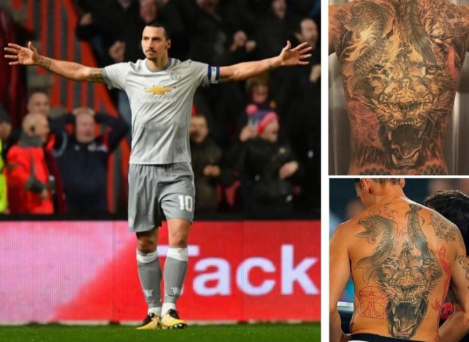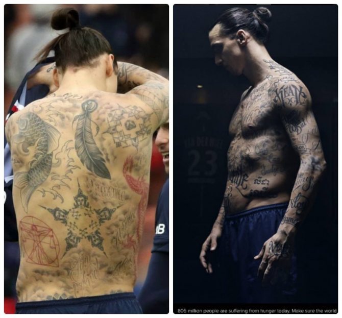 El famoso delantero sueco es un gran aficionado al arte corporal. Casi todo el cuerpo del genio del fútbol está cubierto de todo tipo de tatuajes. El sueco decidió grabar su nombre en árabe. El jugador tiene las fechas de nacimiento de su madre, padre, hermana y hermanos en sus muñecas. Zlatan se dejó los hombros por los nombres de sus hijos. El legendario delantero tiene un dragón y dos ases en su lado derecho. El futbolista dice que puede recrear toda su vida a partir de los patrones de su torso.