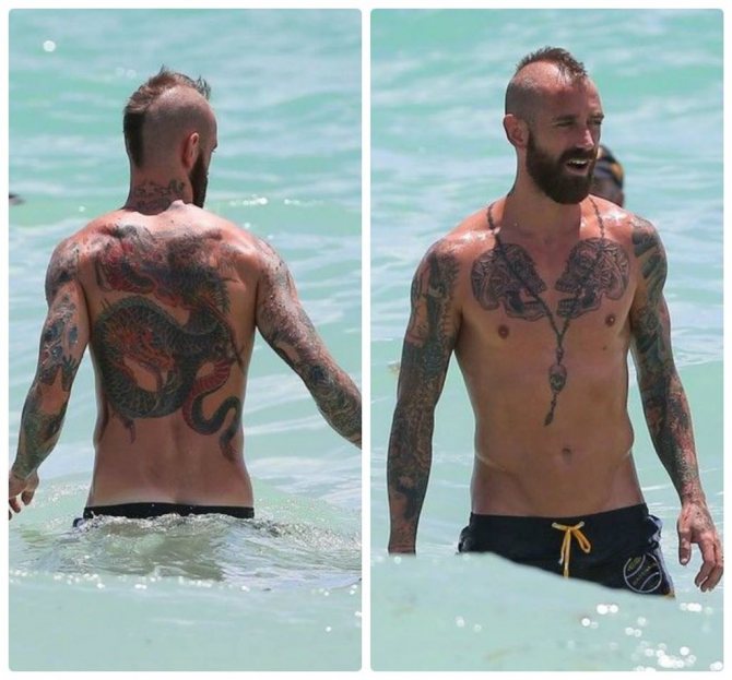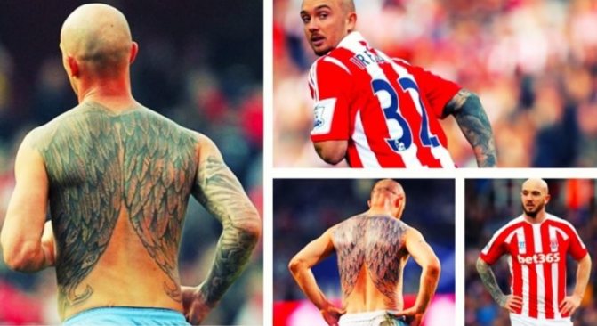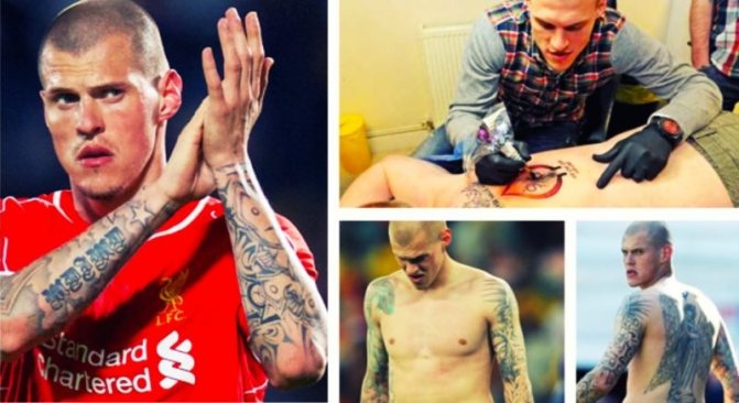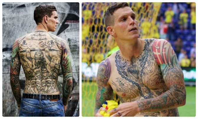 - Daniel Agger.. El hombre de esta lista destaca por algo más que su pasión por los tatuajes. Al futbolista, en su tiempo libre, también le gusta actuar como tatuador. El cuerpo del deportista está adornado con una impresionante imagen de un vikingo y expresiones aladas.