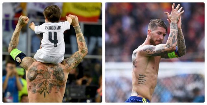 - Sergio Ramos. Y este futbolista está cubierto de todo tipo de tatuajes desde la cabeza hasta las caderas. La mayoría de las imágenes son inscripciones y símbolos en diferentes idiomas.