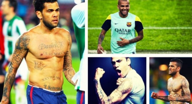 El defensa extremo de la selección de Barcelona ha coleccionado un montón de tatuajes en su cuerpo. En su antebrazo derecho hay una foto de su ex mujer. En sus brazos están los nombres de sus hijos. Como muchos futbolistas, Dani Alves no ha ignorado el tema religioso. Tiene el rostro de Jesucristo en su antebrazo izquierdo. Los tatuajes de los futbolistas con estas imágenes, según los jugadores, ayudan en el deporte y en la vida.