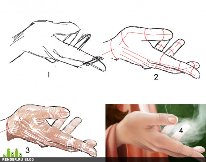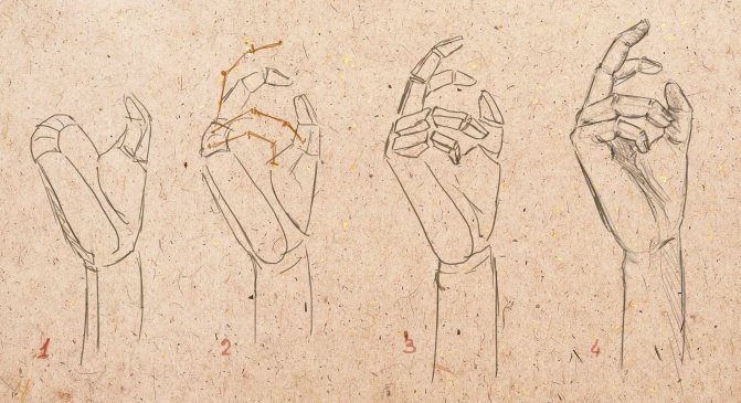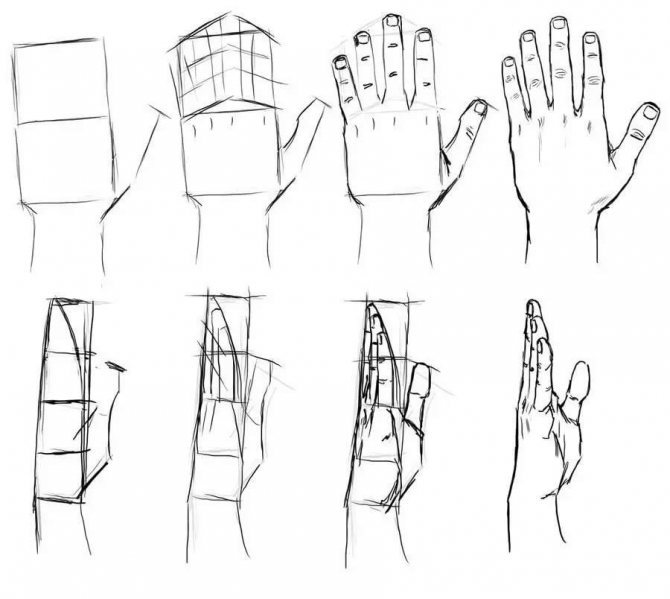 Kasutage selle mõistmiseks ülaltoodud joonist. Jagage käsi kujunditeks, see on mugav skeleti joonistamiseks, ja peopesa näitab ümarat trapetsit, sõrmed ristkülikutega ja sõrmeotsad tilkumisringiga.