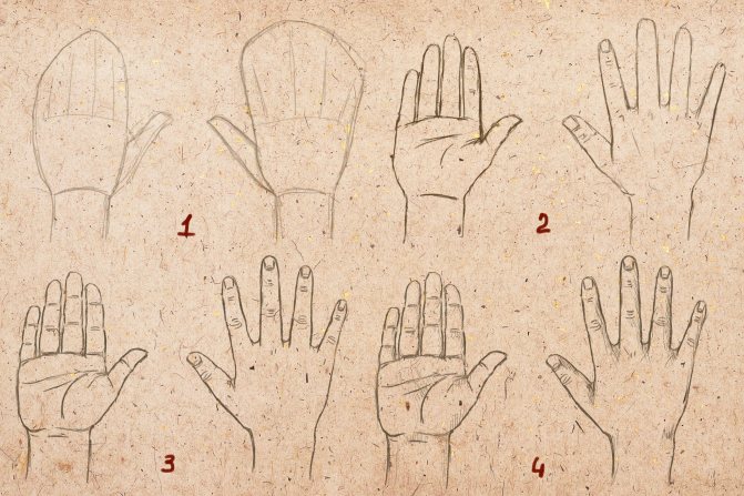 - Visandage kergelt pintsli kuju. Järgnevalt tõstke esile pöidla kuju ja suund, ilma üksikasju joonistamata. Näita teiste sõrmede suunda joonte abil.