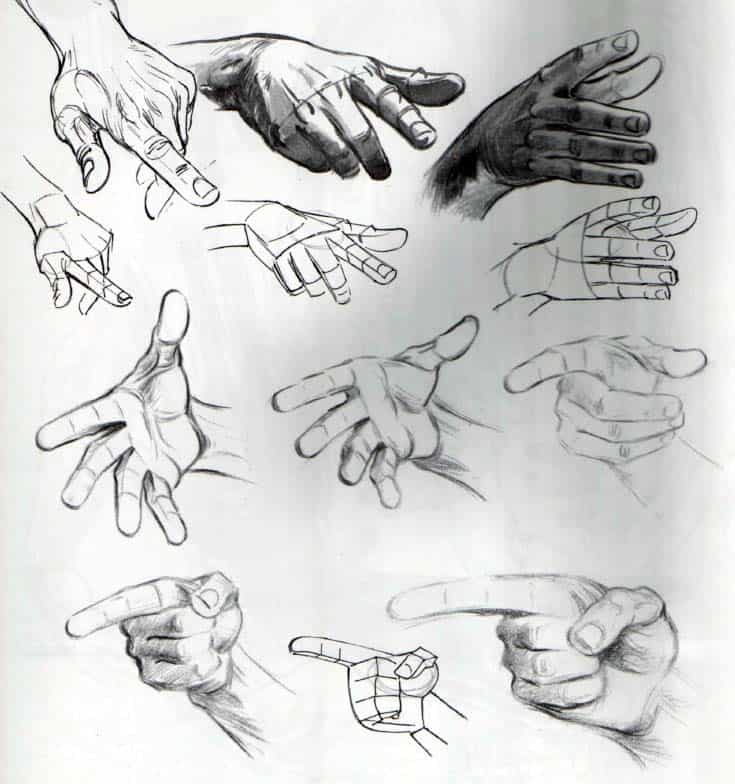 Vaadake oma käsi - oma ja ümbritsevate inimeste käsi. Kuidas on pöidlad paigutatud? Kuidas muutuvad nende jooned erinevate žestide puhul? Millised on meeste käed võrreldes naiste kätega? Mille poolest erinevad teie vanaema käed teie omast? Kas sa tunned oma sõbrad ära nende käte järgi? Tee palju kiireid visandeid kätest, mida oled elus näinud või mis sind fotodel ja videotes huvitavad. Ärge muretsege proportsioonide pärast, püüdke lihtsalt nende ilme.