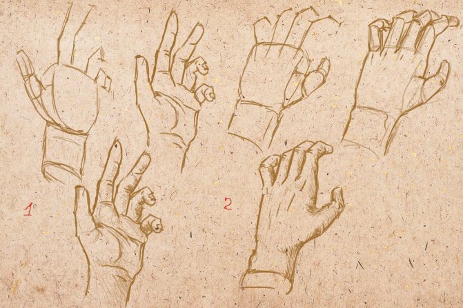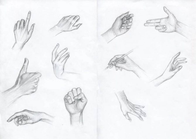 Joonistage oma käed erinevates asendites, kasutades peeglit, erinevate nurkade alt, alustades alati kõige lihtsamatest kujunditest. Võite ka jõuliselt visandada ja seejärel detailid viimistleda. Ärge jahtige üksikasju, otsige laiu, lihtsaid kujundeid.